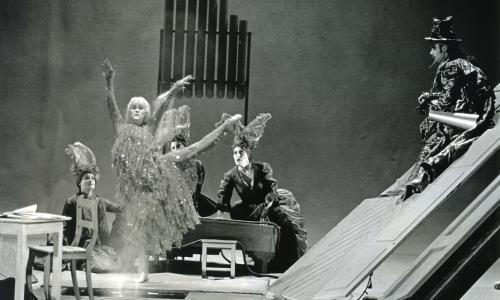 3 Picc. (1. auch Fl.) · 2 · 3 (3. auch Baßkl) · 2 · Kfg. - 4 · 3 · 3 · 1 - S. (hohe Trgl. · Trgl. · 4 Beck. · Nietenbeck. · Hi-hat · Tamt. · Schellenbaum · Dobaci · 3 Peitschen · Claves · Woodbl. · Tempelbl. · Marac. · kl. Tr. · mehrere Rührtr. · gr. Tr. · Brummtopf · 2 Bongos · 6 Tomt. · 6 Ro-totoms · 8 Stalagmitentr. · Jazz-Schlagzeug · Crash · Ride · China Type · Metal Chimes · Shell Chimes · mit Wasser gefülltes Schaff [mit Gartenschlauch] · Flex. · Gl. · Zimb. · Zimbelspiel · Gong · Röhrengl. · Xyl.)(3 Spieler) - 2 Hfn. · Cel. · Org. (auch vom Band) · Hackbr. - Str. Bühnenmusik: 2 Klarinetten · Trompete · Tuba · Klavier · Violine · Kontrabass · Weingläser (der Orakelfrauen) · 6 Pauken